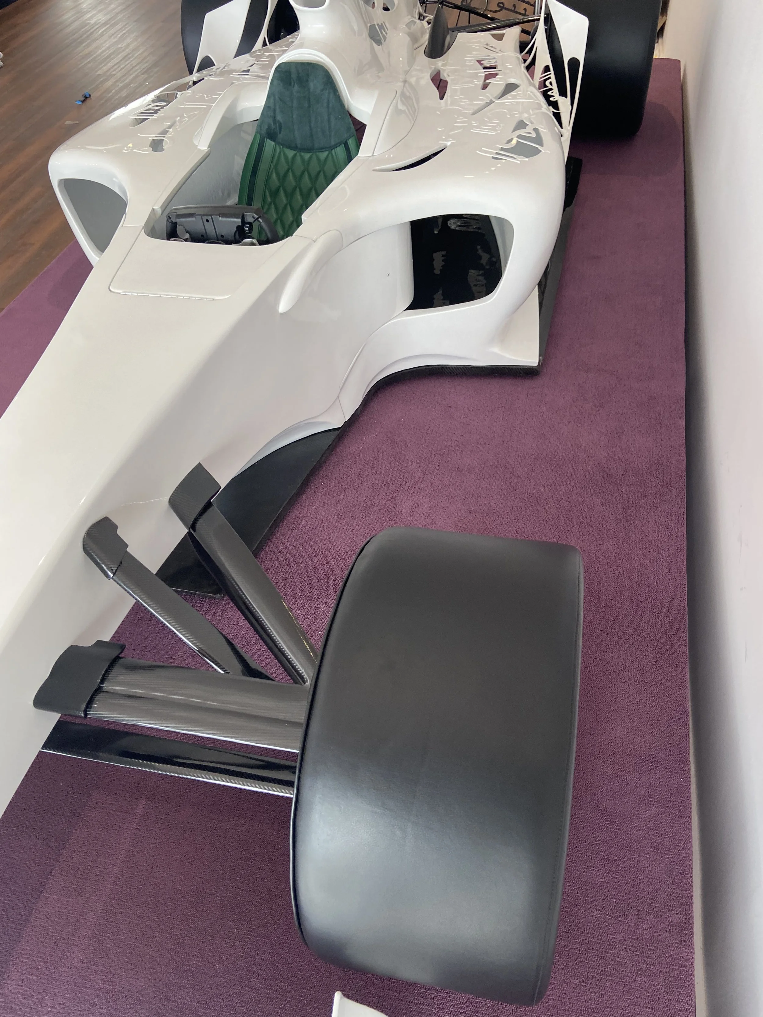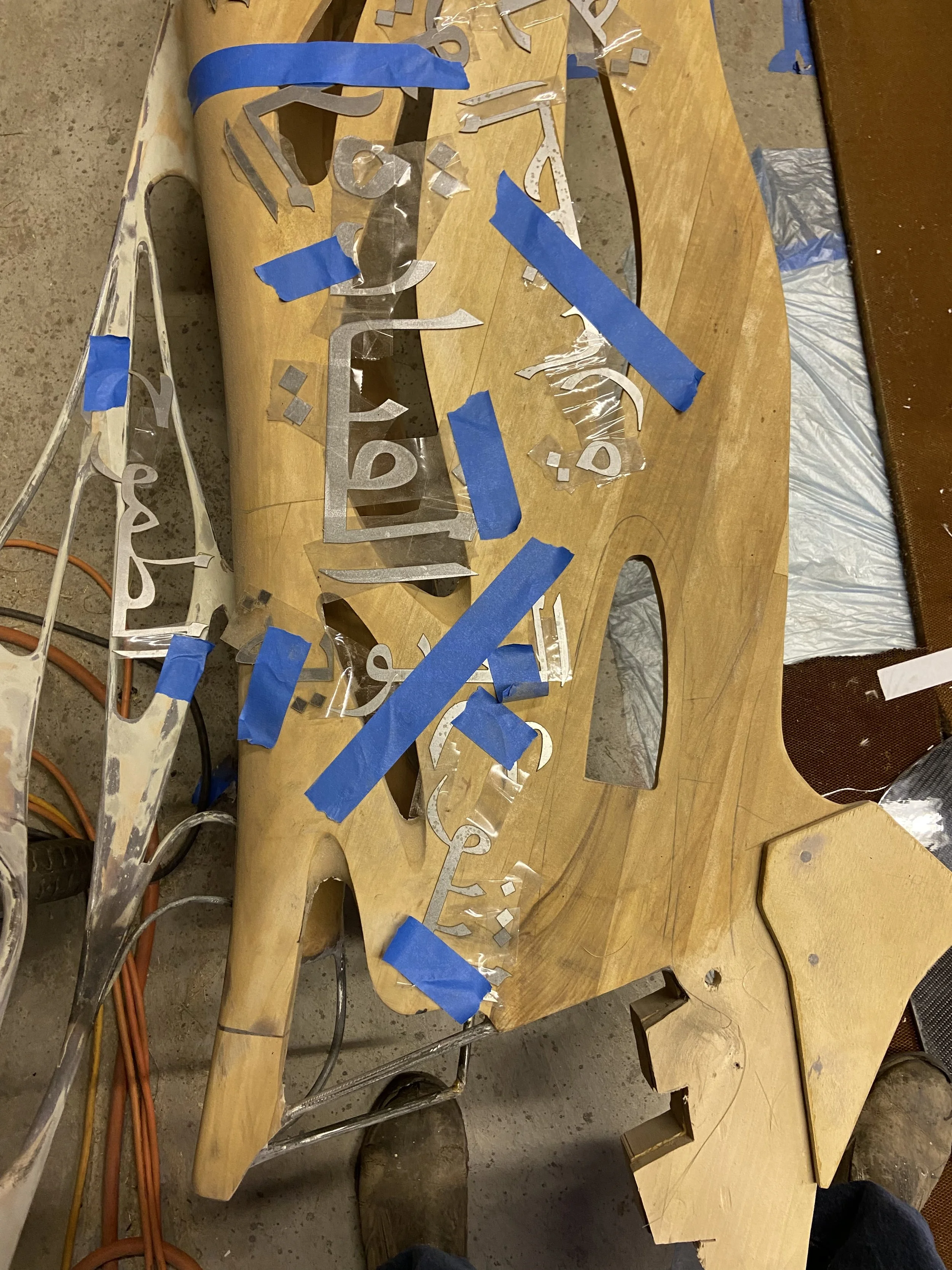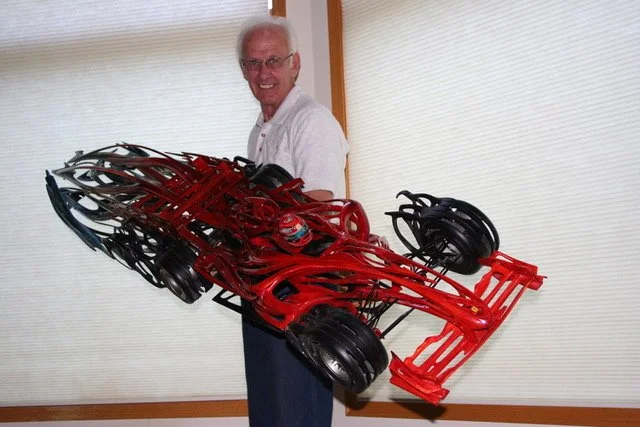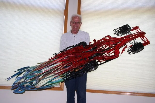 The client requested that his Porsche GT3 convey a sense of speed and motion. I believed that the best way to achieve this was to incorporate the Martini colors, which I thought would effectively convey this objective. The Martini colors consist of stressed hollow 26 gauge aluminum that is triangulated at all intersections, making the entire sculpture a stressed member. This design allows the sculpture to be completely lifted by the front nose or the rear Martini ‘ribbons,’ resulting in exceptional strength and lightweight. The Martini ‘ribbons’ took over seven months to achieve this result after multiple attempts.