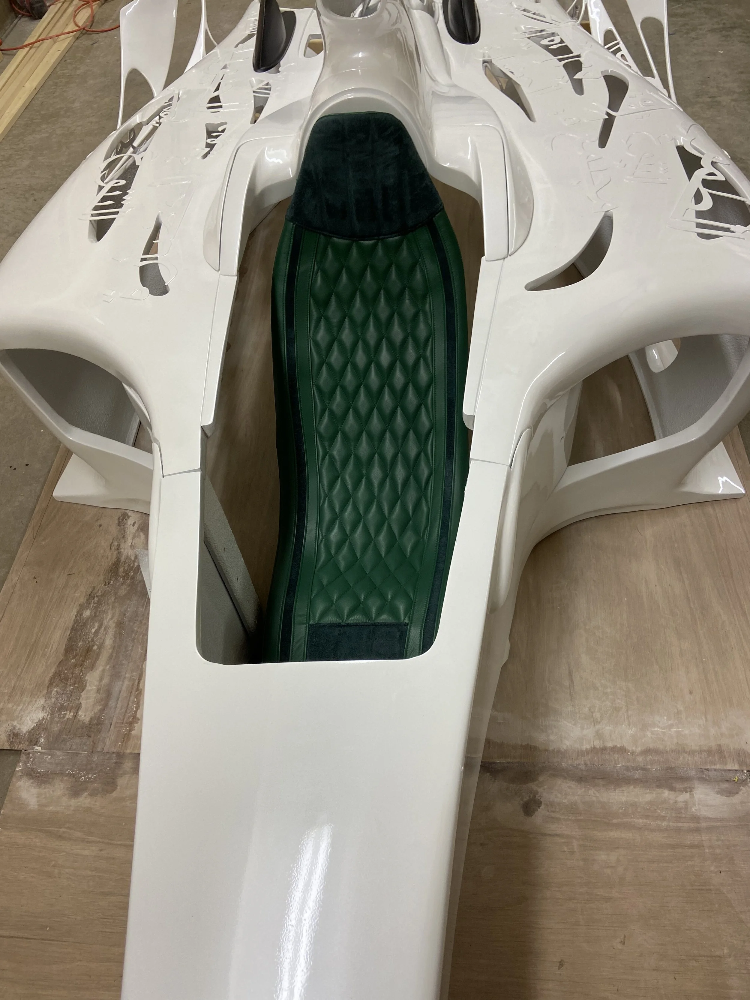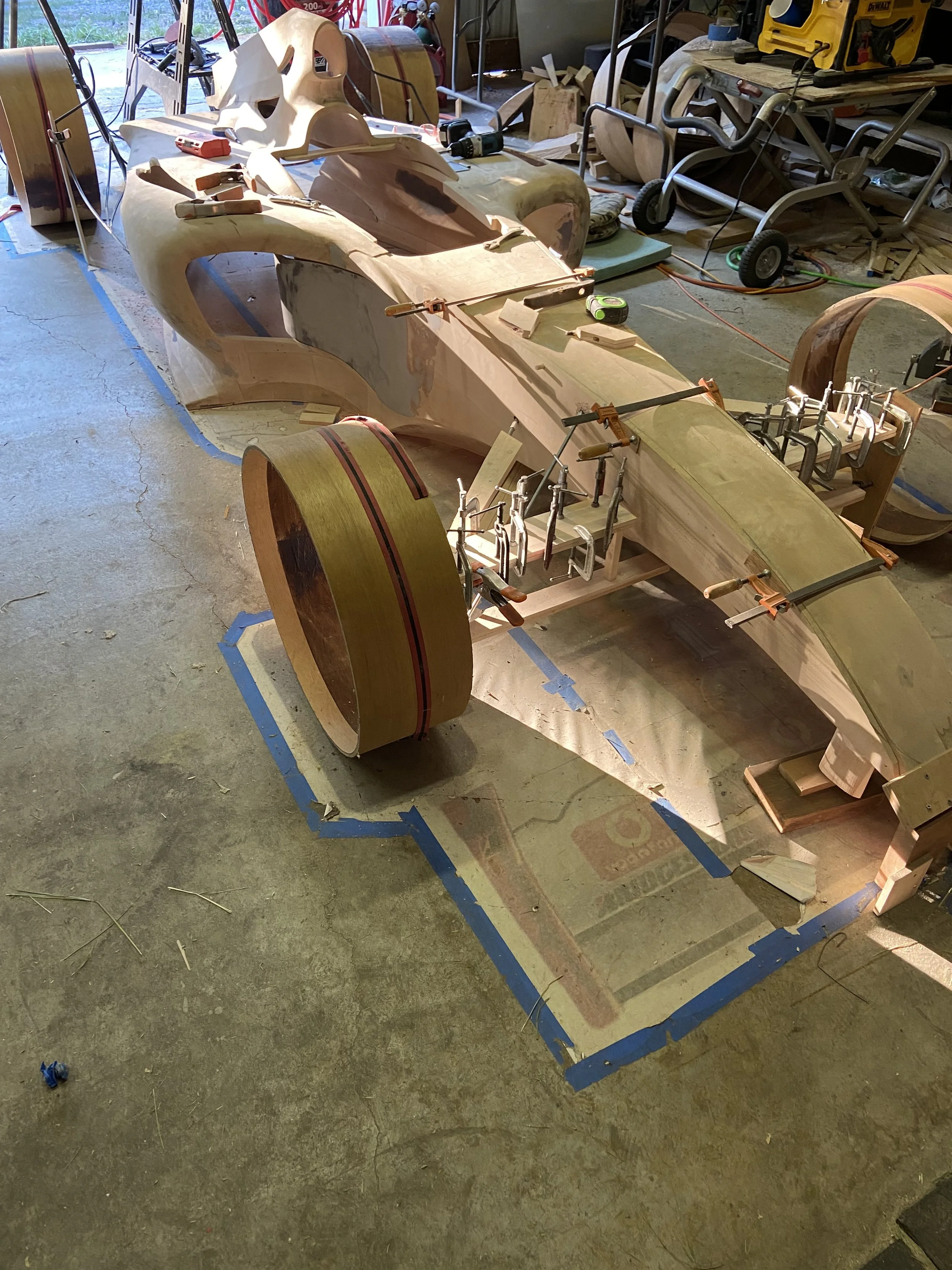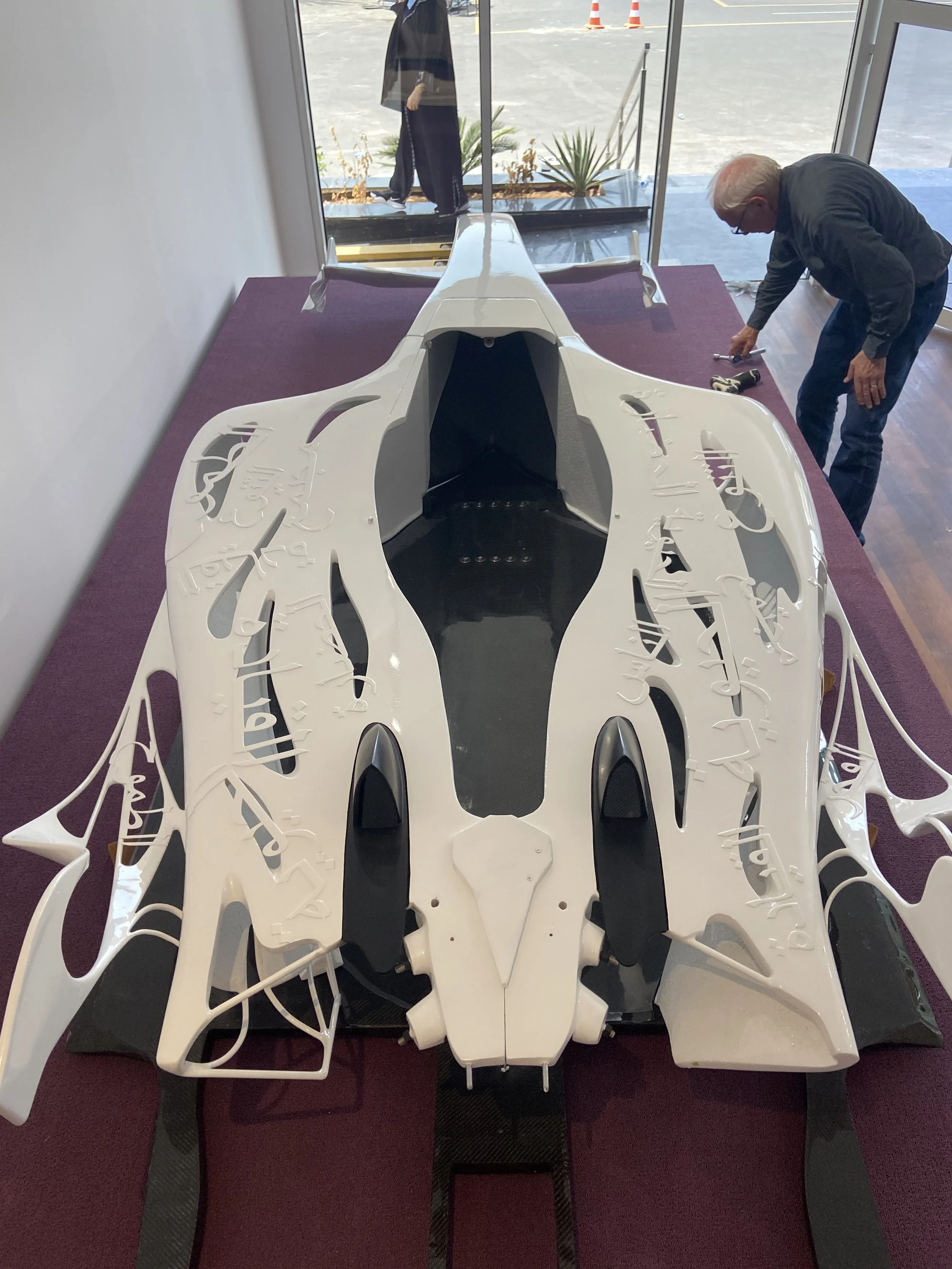 The client requested that his Porsche GT3 convey a sense of speed and motion. I believed that the best way to achieve this was to incorporate the Martini colors, which I thought would effectively convey this objective. The Martini colors consist of stressed hollow 26 gauge aluminum that is triangulated at all intersections, making the entire sculpture a stressed member. This design allows the sculpture to be completely lifted by the front nose or the rear Martini ‘ribbons,’ resulting in exceptional strength and lightweight. The Martini ‘ribbons’ took over seven months to achieve this result after multiple attempts.