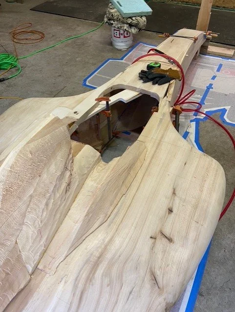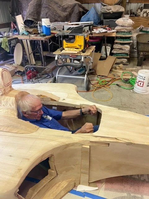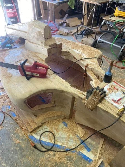 Sculpture of my clients jet, in all wood, with the V tail and wing tips blurred to help depict speed.