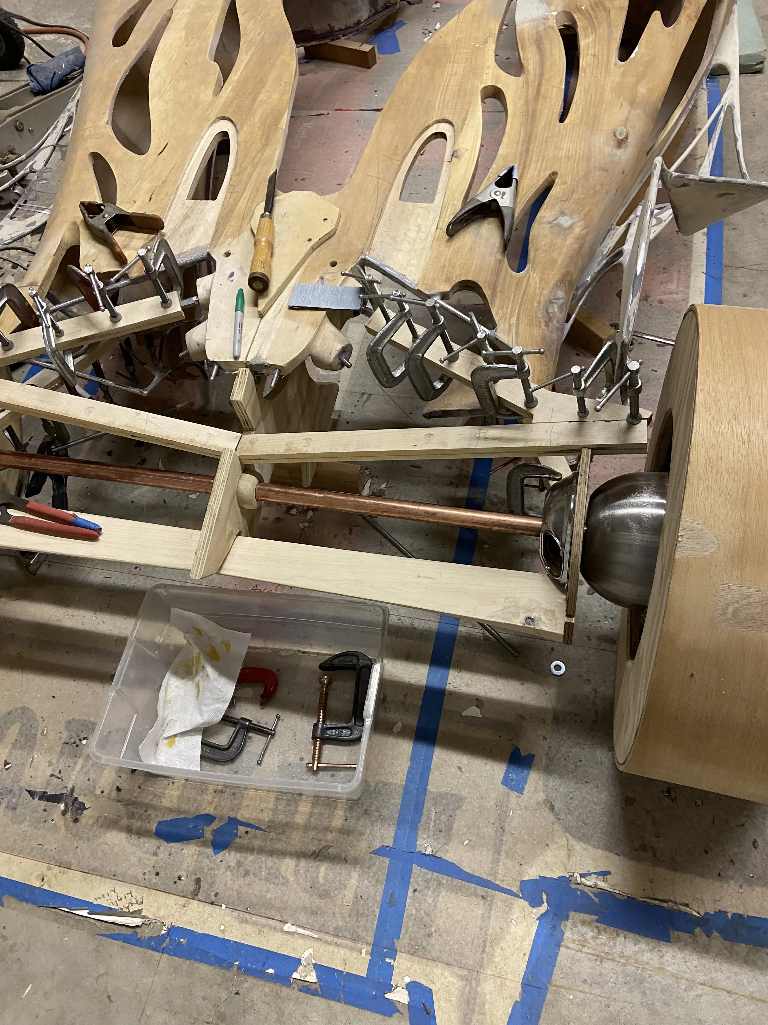 Another combination of wood and steel where there is no discernible connection of the two mediums of wood and steel.