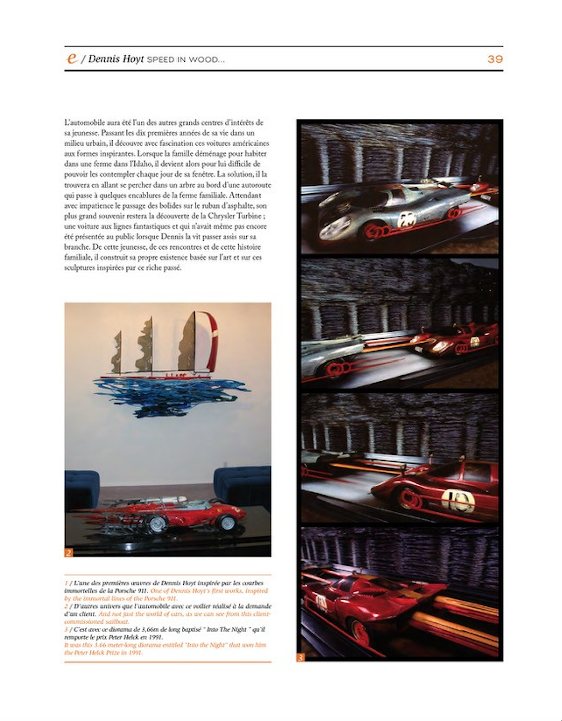 Cover page of a magazine featuring the work of artist Dennis Hoyt, showcasing three images of his wooden sculptures of race cars with intricate wooden frame structures. The left side of the page has a photo of Dennis Hoyt smiling with a partially com