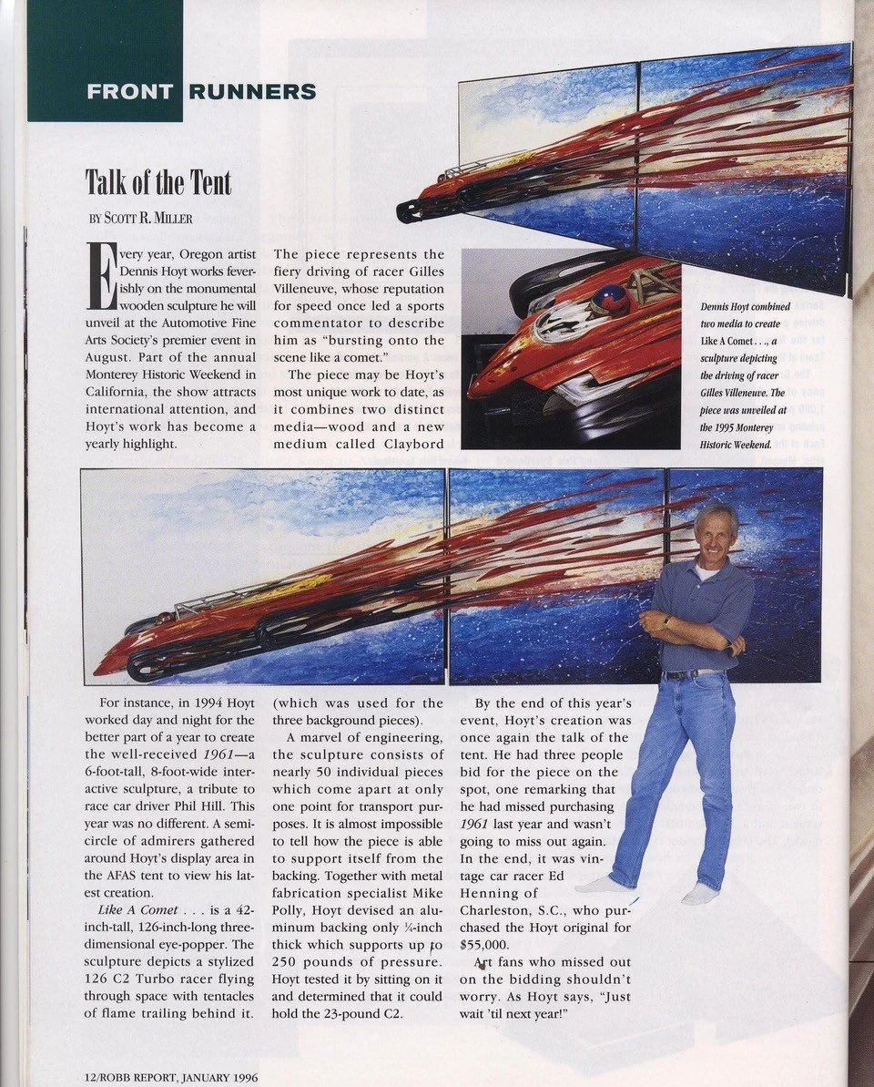 A magazine article titled "Talk of the Tent" by Scott R. Miller featuring Dennis Hoyt's sculpture of a race car and driver, with a photo of Hoyt standing with arms crossed. The sculpture is a stylized, elongated race car depicted in wood and Claybord