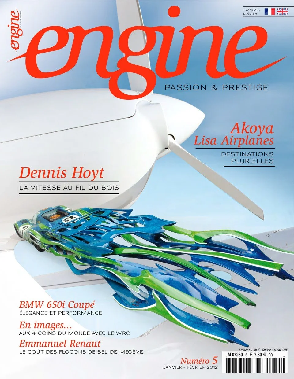 The cover of a magazine titled 'Engine' features a close-up of an airplane wing and tail with a futuristic, colorful racing car model at the bottom. The magazine covers topics like aviation, cars, travel destinations, and notable personalities. The t